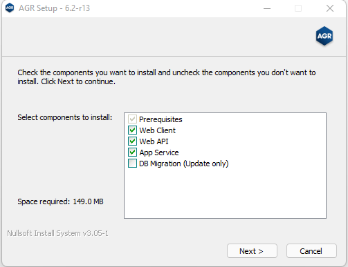 Time to install the website and the scheduling service. Run the AGRInstaller_6.x-rx.exe installer on the webservice machine! When installing a new instance of AGR check the “Web Client”, “Web API” and “AppService” components.