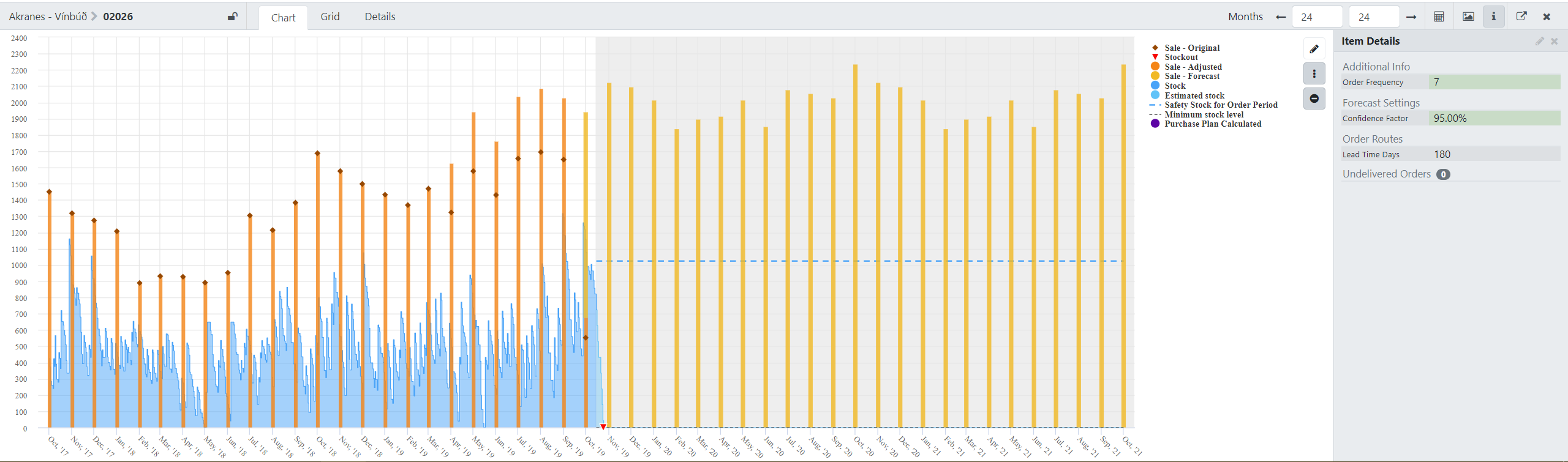 Order period: Remember that the safety stock is calculated relative to the order period. The item chart can be in days, weeks and months but the safety stock number will always be displayed as a horizontal line regardless of the time scale.