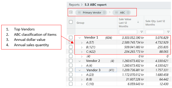 - Now turn the grouping aorund: 1st on Primary vendor and 2nd on ABC, this classifies the product portfolio within each vendor into ABC items.